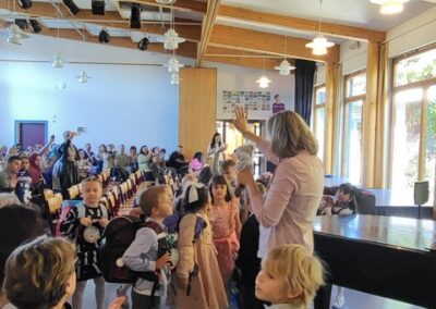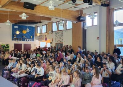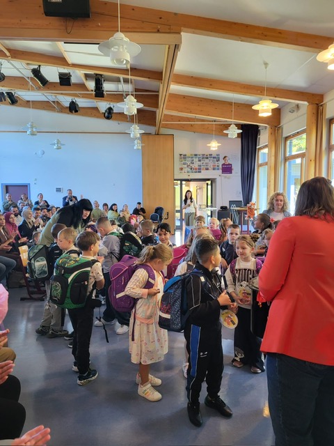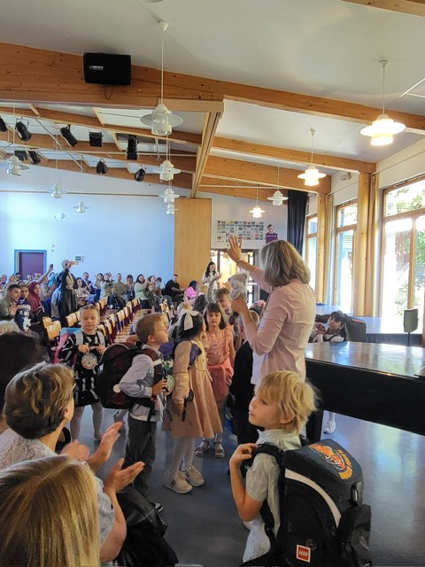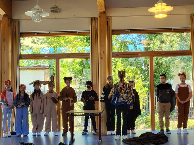 Anschließend gestalteten die Kinder der höheren Klassen ein buntes Programm. Zum Thema „Team“ präsentierten Theater-AG und Chor ein abwechslungsreiches Stück, indem die individuellen Stärken verschiedener Tiere schließlich zum Erfolg führten. Fuchs und Koala begleiteten anschließend die Erstklässler, die schon aufgeregt auf ihre erste Unterrichtstunde warteten, als Maskottchen in ihre Klassenzimmer. Währenddessen wurden die Familien von Eltern aus den Klassen 4 mit Kaffee und Kuchen bewirtet – herzlichen Dank auch an dieser Stelle an die fleißigen Helfer!